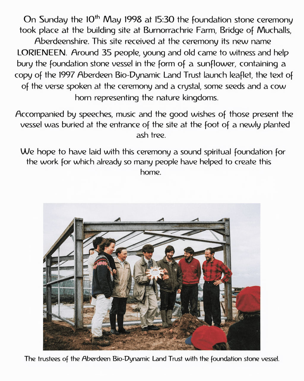 Below we have added the details of the foundation stone ceremony that took place in 1998. We hope to continue on the values and the intentions from which the project started serving and feeding our community whilst nurturing the land we are caretakers for.